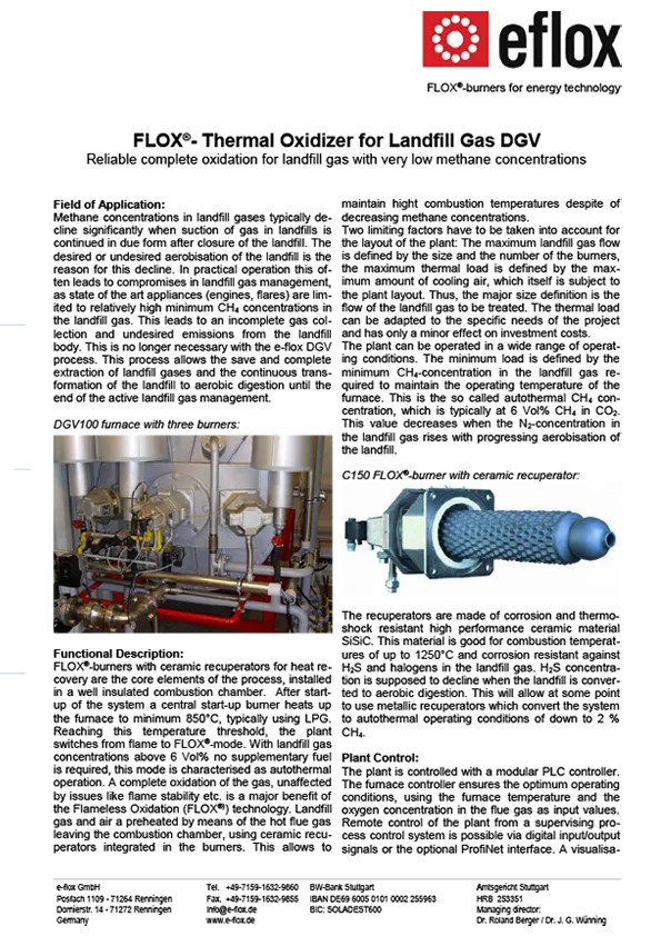 e-flox develops combustion systems for treating landfill gas with very low methane concentrations. A characteristic feature of the systems is the complete, slip-free combustion of the gas with maximum utilisation of the waste heat generated. e-flox systems are already in successful use in numerous European countries.